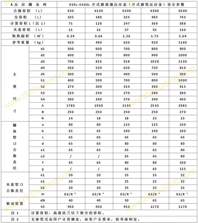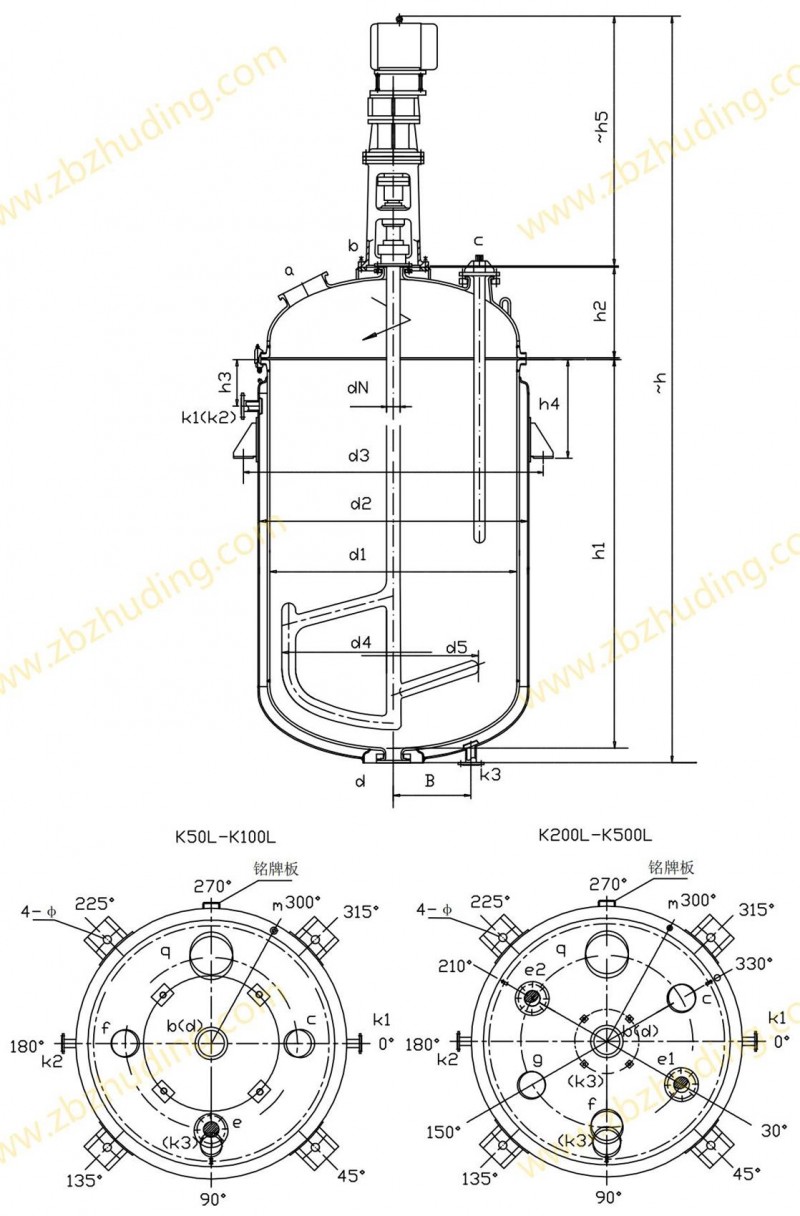 K50L-K500L开式搪玻璃反应釜(开式搪瓷反应釜)设计图纸及参数如下所示: