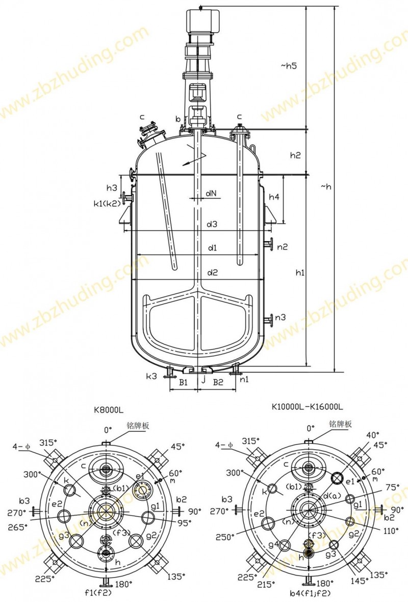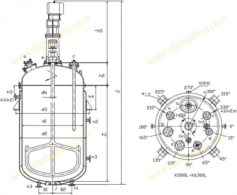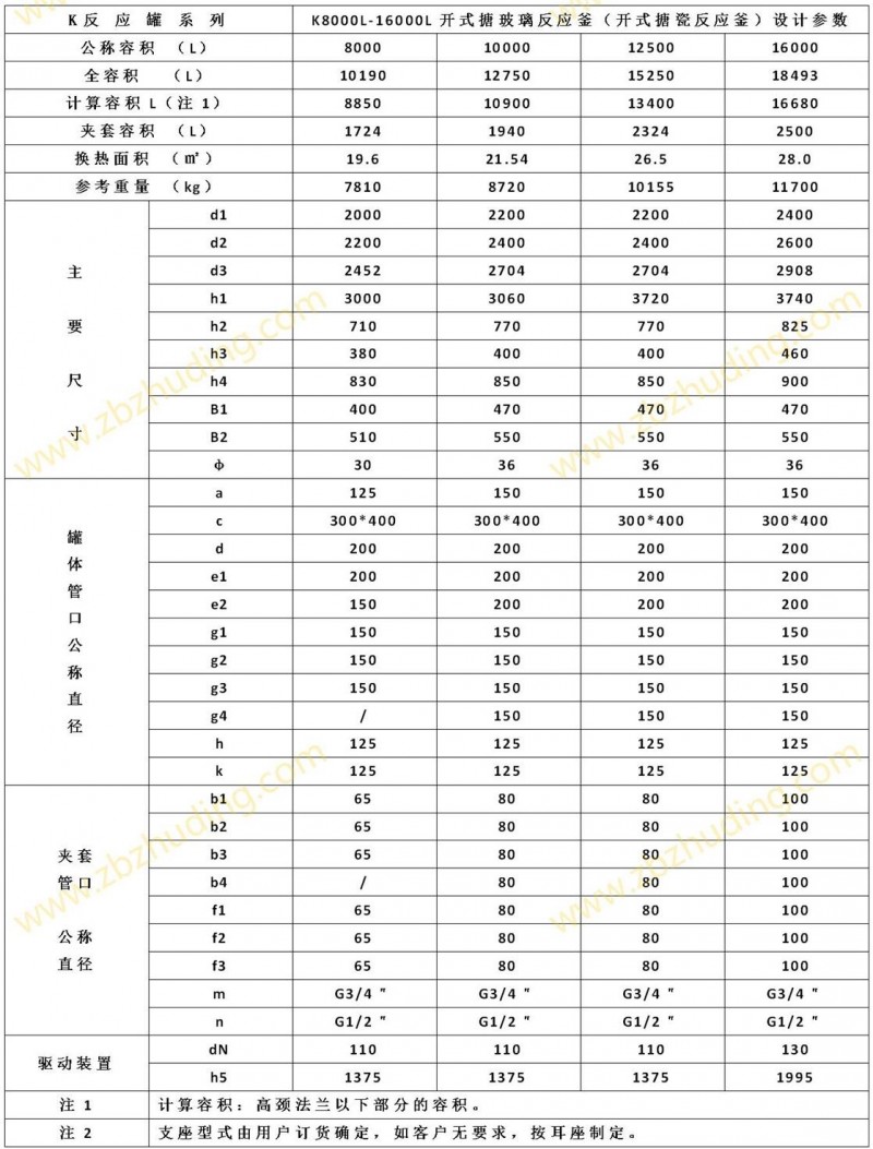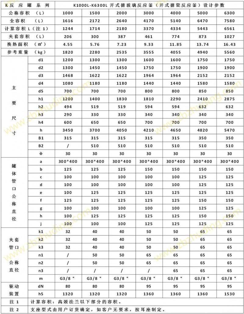 【K型搪玻璃反应器的技术参数】: K1000L-K6300L开式搪玻璃反应釜(开式搪瓷反应釜)设计图纸及参数如下所示: