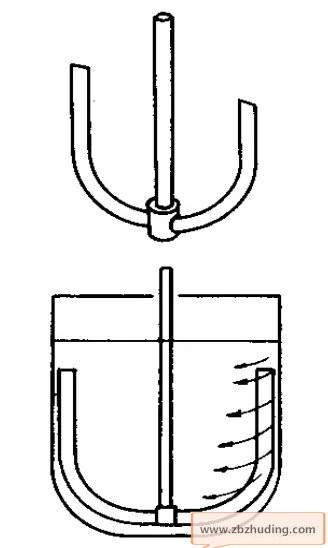 适用于粘度在100Pa·s以下的流体搅拌,当流体粘度在10~100Pa·s时,可在锚式桨中间加一横桨叶,即为框式搅拌器,以增加容器中部的混合。