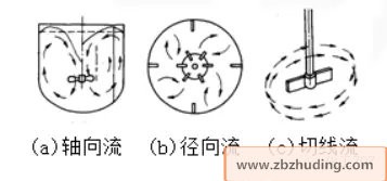 流体流动方向垂直于搅拌轴,沿径向流动,碰到容器壁面分成二股流体分别向上、向下流动,再回到叶端,不穿过叶片,形成上、下二个循环流动。